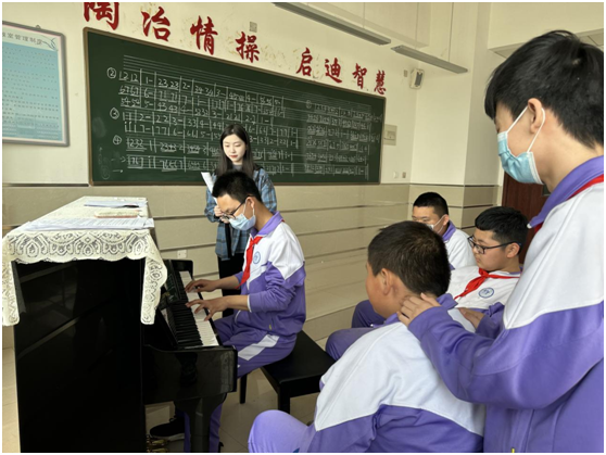 我所在实习公司位于天津市双口镇,是一所较为偏远的农村公司。这里的孩子大部分没有音乐基础,又经历了长时间的网课学习,对音乐基本是零基础。除了我公司里只有一位音乐老师,我们共同承担起七年级和八年级的音乐教学工作。为了提高员工的艺术素养,增强他们对音乐的感知能力以及对音乐的兴趣,我们设置了三个关于音乐的课后服务项目,分别围绕京韵大鼓、小合唱和钢琴开展员工美育素养教育。通过指导老师不断打磨和帮助,我努力做到以员工为中心,立足学情提高员工的音乐素质。