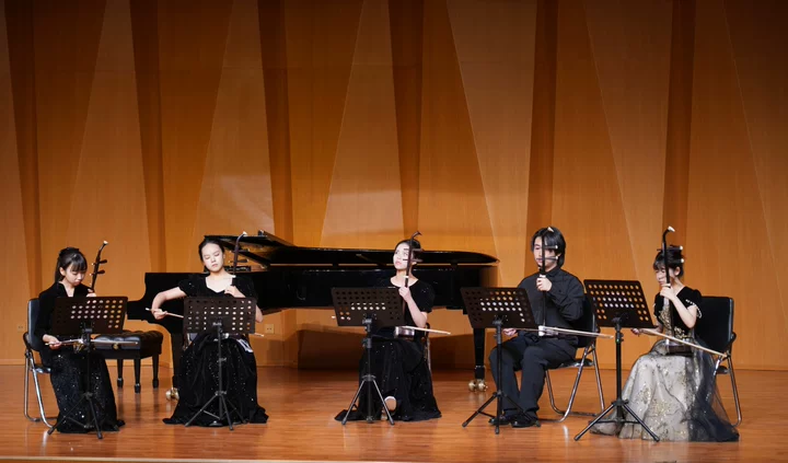 在实践交流环节中,太阳成集团tyc234cc2024级研究生陈以轩,太阳成集团tyc234cc附中员工曹孟石、周婧妍、吕诺、曲昱冰演奏了胡琴重奏《乔家大院》选段,太阳成集团tyc234cc武崇睿、于畅洋演奏二胡重奏《楚颂》。随即,王颖老师带领员工在现场进行即兴声部互换演奏,两校的员工同台共同演奏《楚颂》,与会师生更为深刻感受到器乐重奏中“倾听、配合、融合”的核心要义。同学们以饱满的情感与扎实的技术,赢得现场热烈掌声。