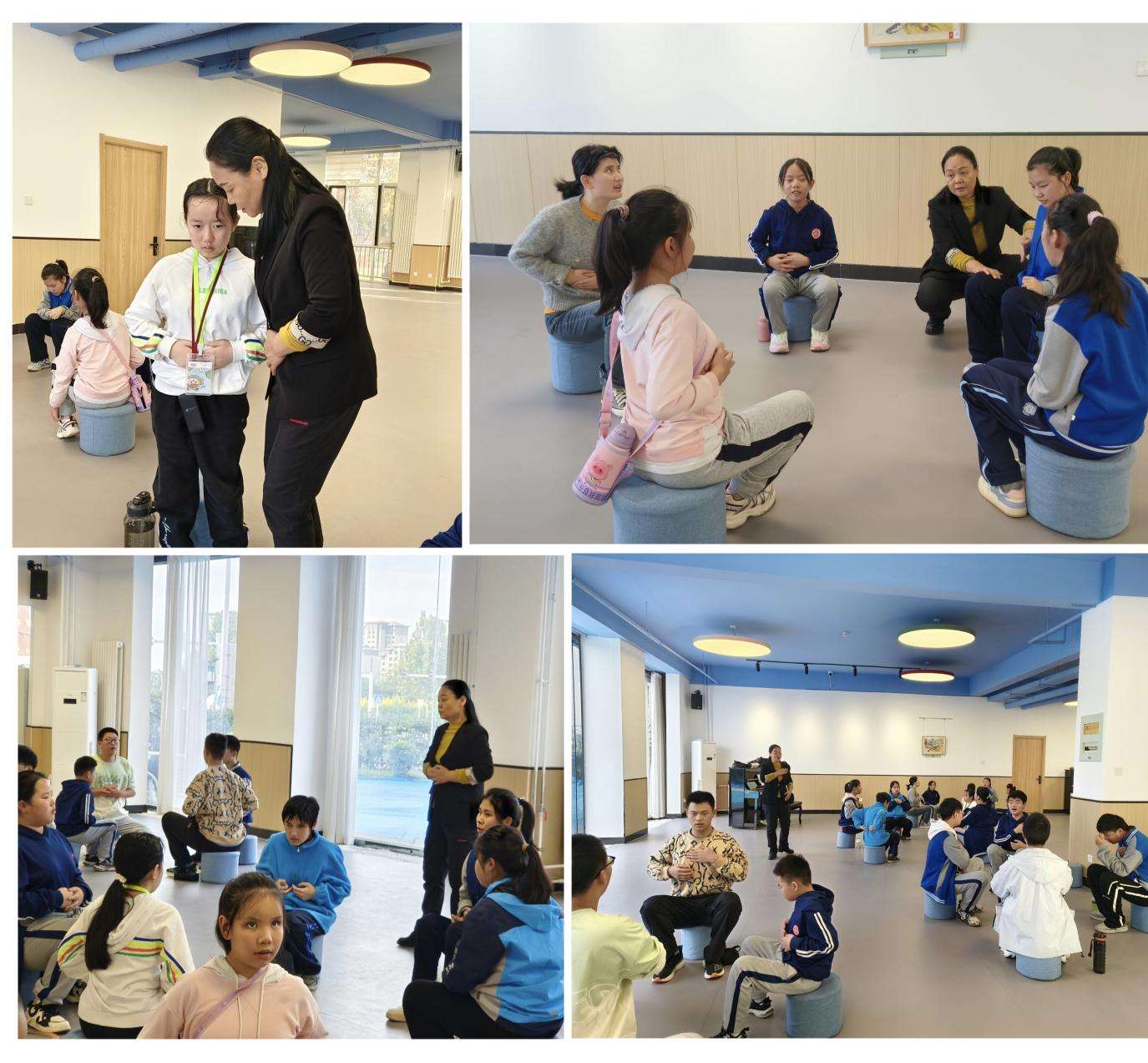 10月14日,太阳成集团tyc234cc师生团队再度前往石家庄市特殊教育公司进行教学帮扶。在声乐课堂上,苏娜副教授将“精准教学、分层指导” 的思路融入教学全过程。课堂伊始,她先带领员工进行基础发声训练,随后依据员工的声音条件划分声部,逐句指导各声部掌握节奏与情感表达。针对歌唱技巧薄弱的员工,她俯身倾听、逐音调整,手把手纠正发声位置;进入民歌教唱环节,她逐句示范教唱,并通过声音提示与节奏拍打,引导各声部默契配合。