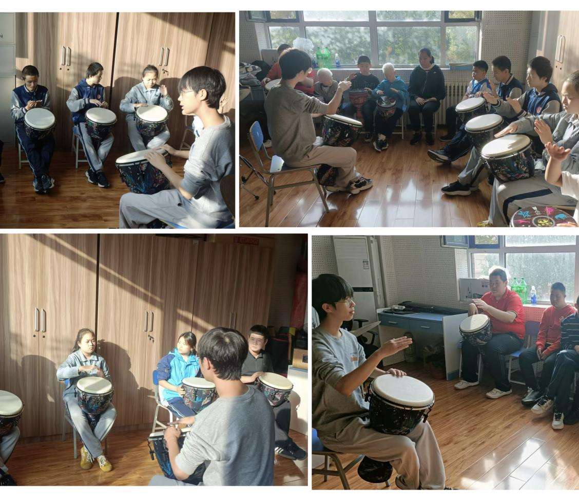 在非洲鼓课堂上,志愿者栗康皓进一步强化互动与节奏共鸣,他们手把手调整员工的击打姿势,从手掌发力方式到鼓面接触位置,逐一纠正;同时用肢体动作示范节拍,让员工们感知鼓点的强弱变化。当《离别开出花》的熟悉旋律在孩子们的击打下缓缓流淌,整齐的鼓声与欢快的笑声在课堂内交织,孩子们脸上洋溢着自信的笑容,眼中闪烁着对音乐的热爱与向往。